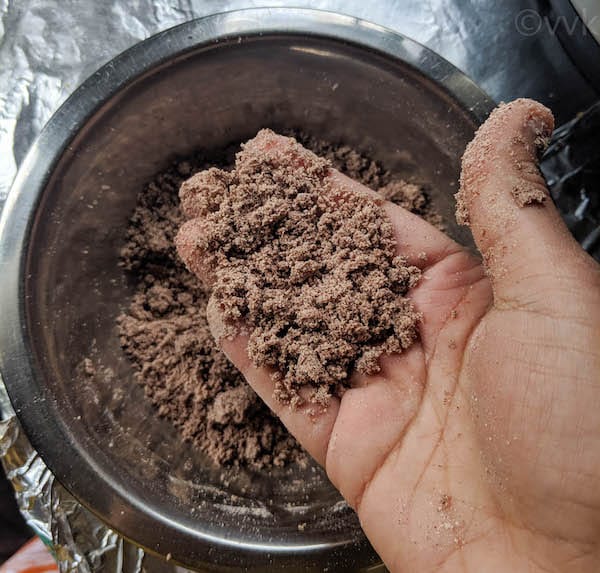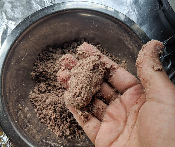 - Consistency check - When you take a small amount of flour in your fist, and press it should form a shape like below. You should be able to break it back to the cornmeal consistency again. So add water as needed.