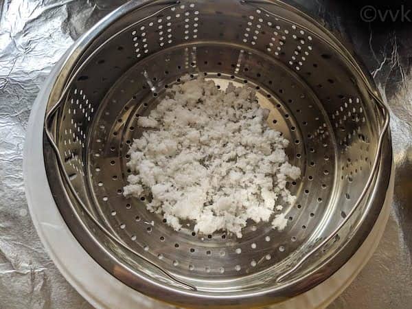 - Now spread ¼ cup of the grated coconut in the steamer rack or basket, as shown below. If you are using a steamer basket with slightly big holes, place a plate beneath the steamer just during layering.