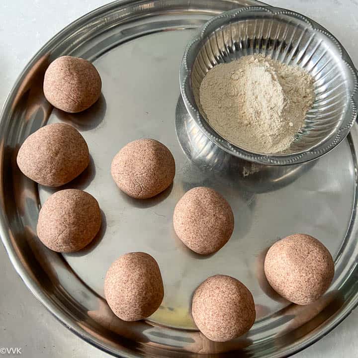 - I like to use an equal measure of ragi and wheat flour. You can adjust it as per your liking. But if you increase the measure of ragi flour, rolling will be slightly difficult.
