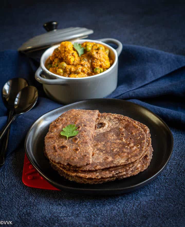 You can serve ragi roti with any dal, sabzi, or paneer gravy and make it a complete meal. I served it with gobhi matar / cauliflower green peas curry.