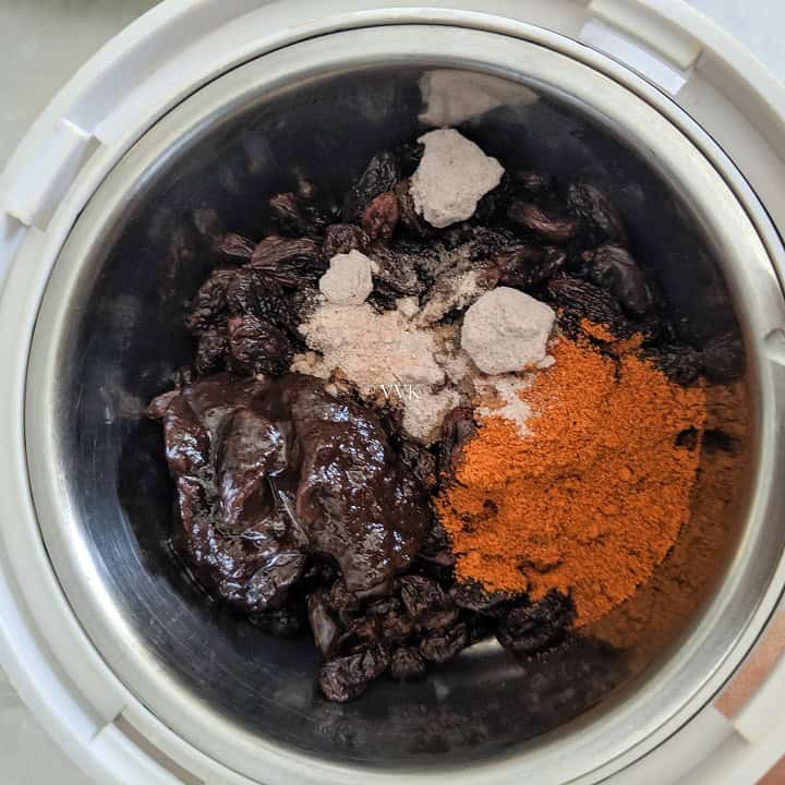 - In a mixer jar, add the soaked and drained raisins, tamarind paste, red chili powder, and black salt.