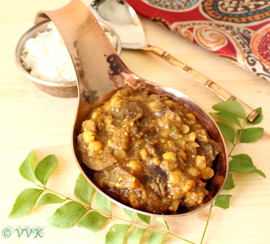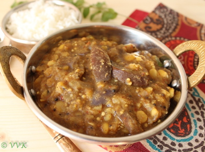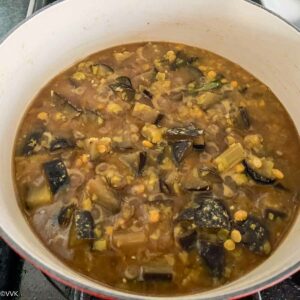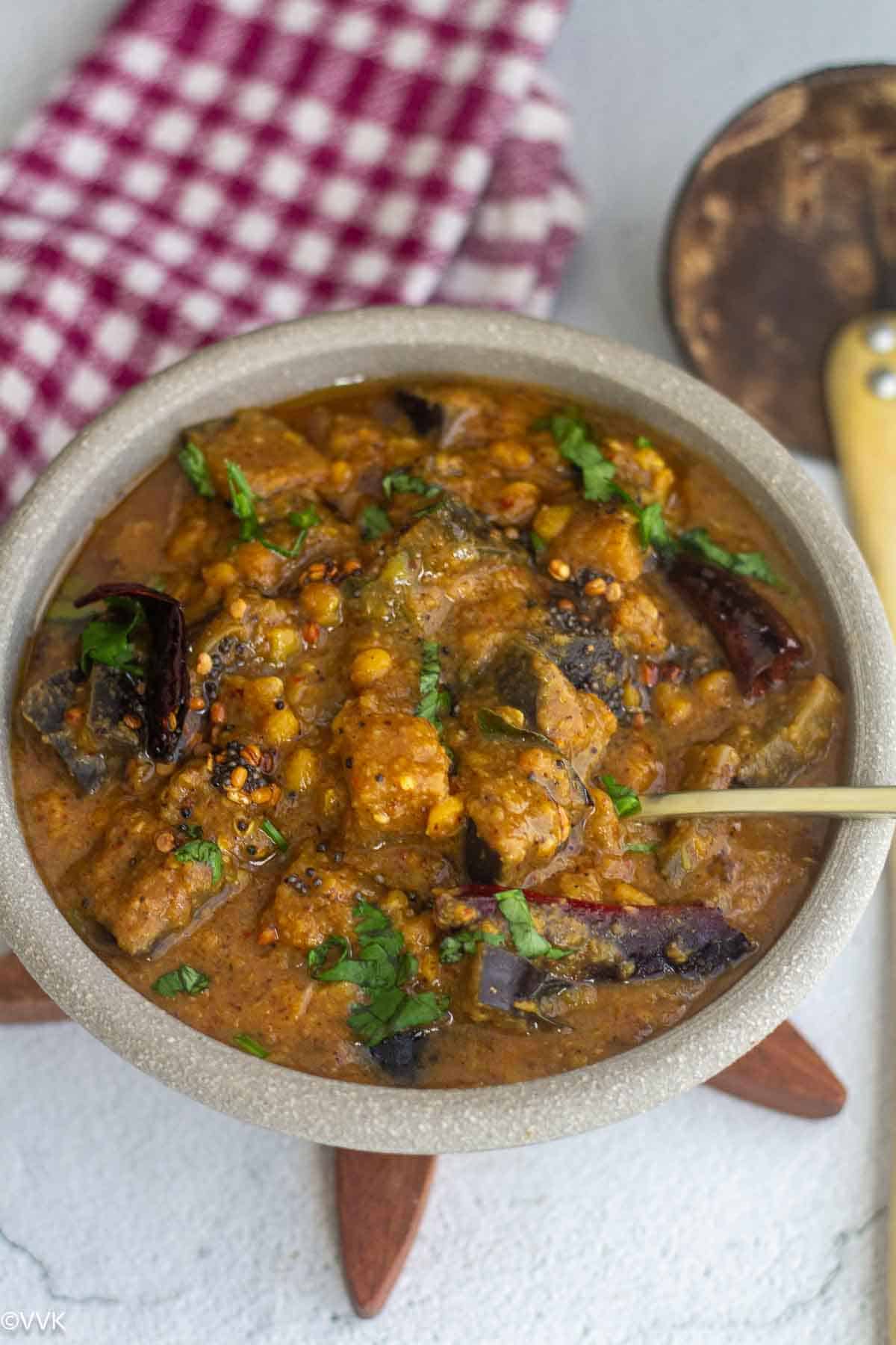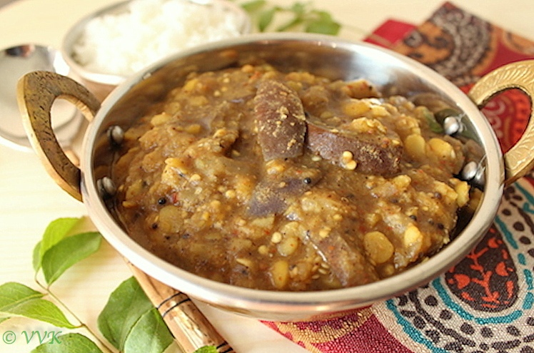 This authentic Tamil-Brahmin dish is typically prepared with tender brinjals (eggplant) or white pumpkin and a unique blend of lentils like chana dal (split Bengal gram) and toor dal, making it a flavorful cross between kootu and arachuvitta sambar.
