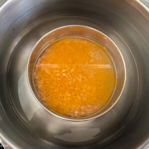 - Pressure cook the toor dal by adding one cup of water, ¼ tsp oil, and ½ tsp turmeric and mash it well. If you are using a stove-top pressure cooker, pressure cook for 4 to 5 hisses/whistles and release the pressure naturally. If using an Instant Pot for pot-in-pot cooking, you can cook for 15 minutes and release the pressure naturally. If using frozen dal, thaw it to room temperature.
