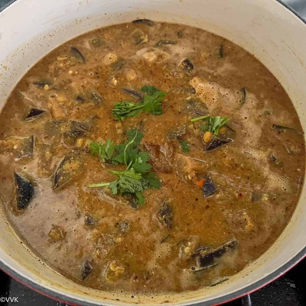 - Mix 2 tsps of tamarind paste with 1 cup of water and add it to the brinjal. Add salt and a few curry leaves, too. Now, over medium heat, cook until the brinjals are soft but not mushy.