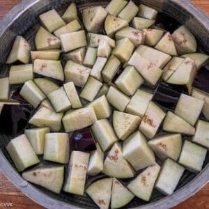 - Chop the brinjals into small pieces and let them soak in water while you do the other prep work. Soaking in water prevents the brinjals from turning black.