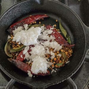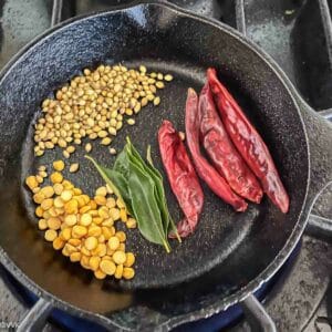 - Heat a pan and roast coriander seeds, chana dal, curry leaves, and dry red chilies without any oil until the chana dal turns light brown.