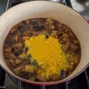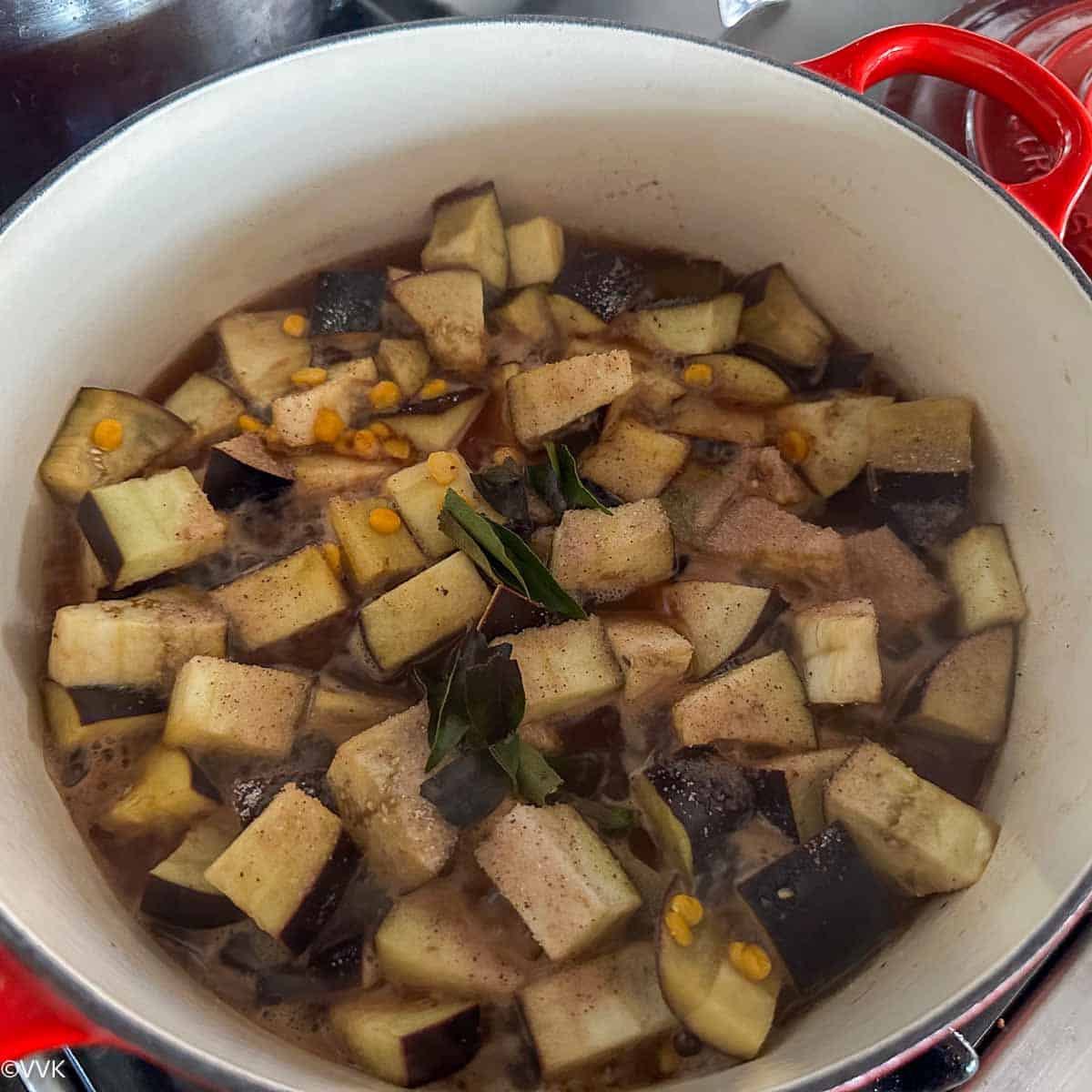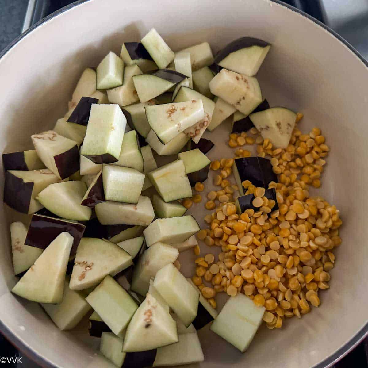 - I have used my Dutch oven to make this rasavangi. You can use any vessel with a heavy bottom. Drain the water from the chopped brinjals and chana dal and add it to the Dutch oven.