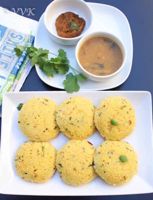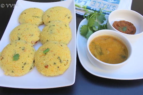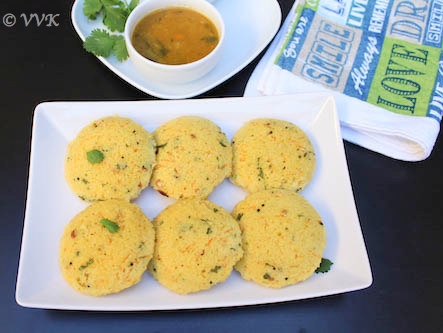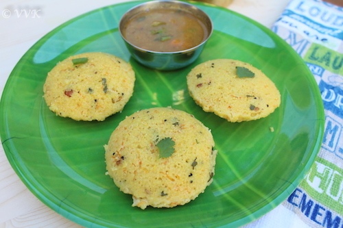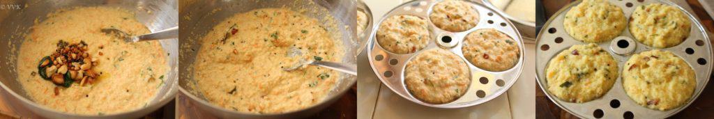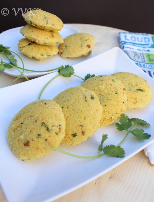 Home-made steamed savory cakes/idli prepared with semolina and yogurt and simple spices with the goodness of carrots and cashews.