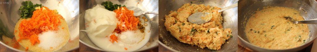 - Transfer the roasted rava to a bowl and add the chopped green chilies, ginger, carrots, cilantro, salt, baking soda, turmeric, sweet paprika.