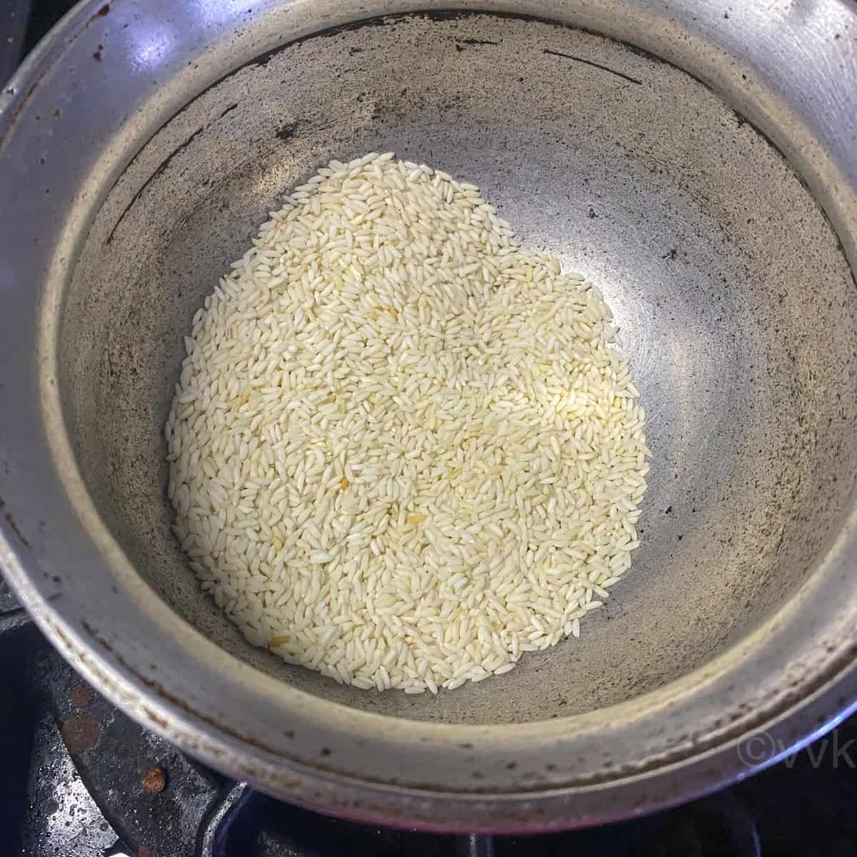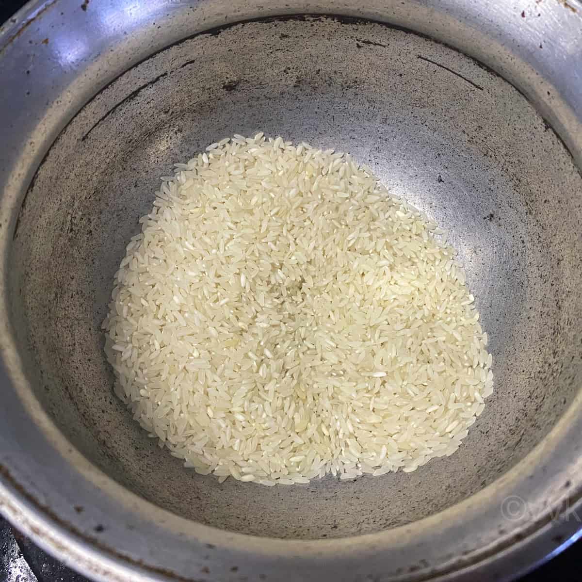 - Add the rice and roast the rice in a heavy bottom pan or kadai (I used my uruli).