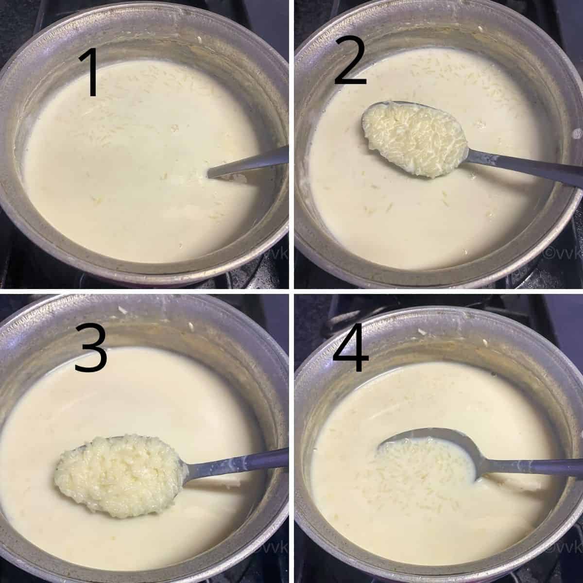We first roast the rice and soak it in water till the milk boils and then add the rice to the milk and let the rice cook in the milk. When the rice is well cooked, we add sugar and cook further, and that’s it.