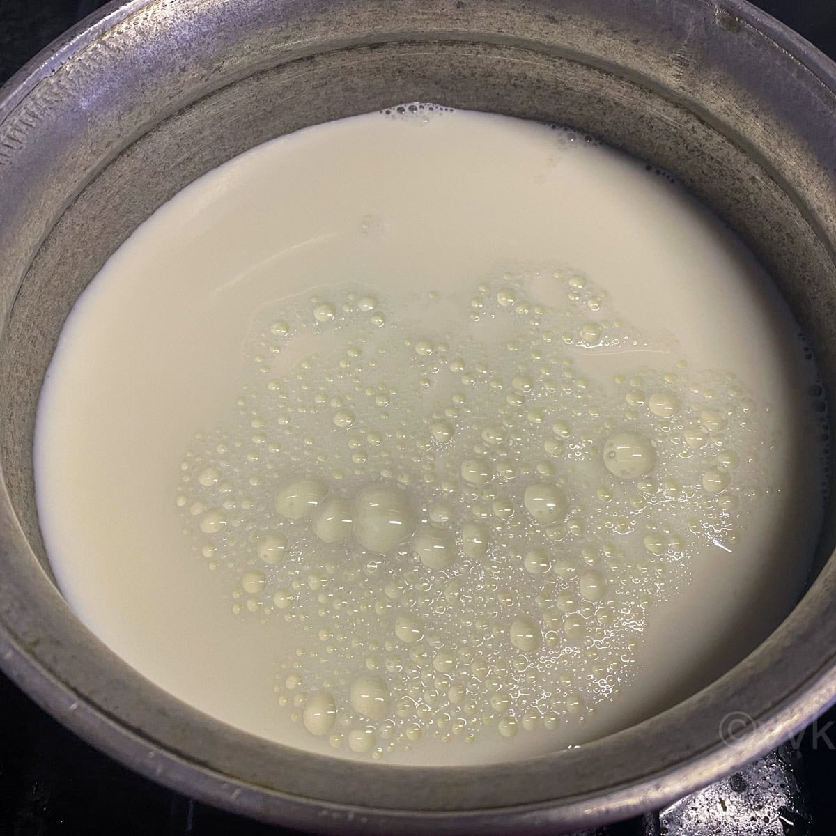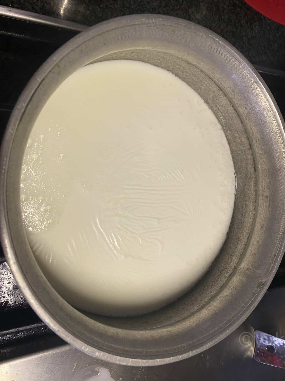 - Reduce the heat to medium-low and let the rice cook in the milk. Keep a wooden ladle on top of the uruli to not overspill the milk. Keep stirring in between, and during the process, collect the frothy cream, scrape the sides, and add it back to the payasam. We are not making basundi here, but collecting and adding the cream back into the kheer enhances the flavor. Note – It took 35 minutes for the rice to cook. The timing might vary depending upon the vessel and the heat setting.