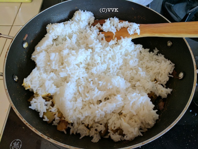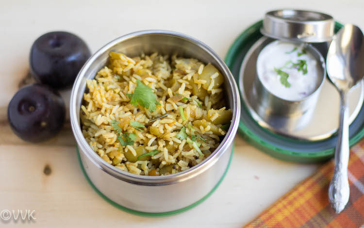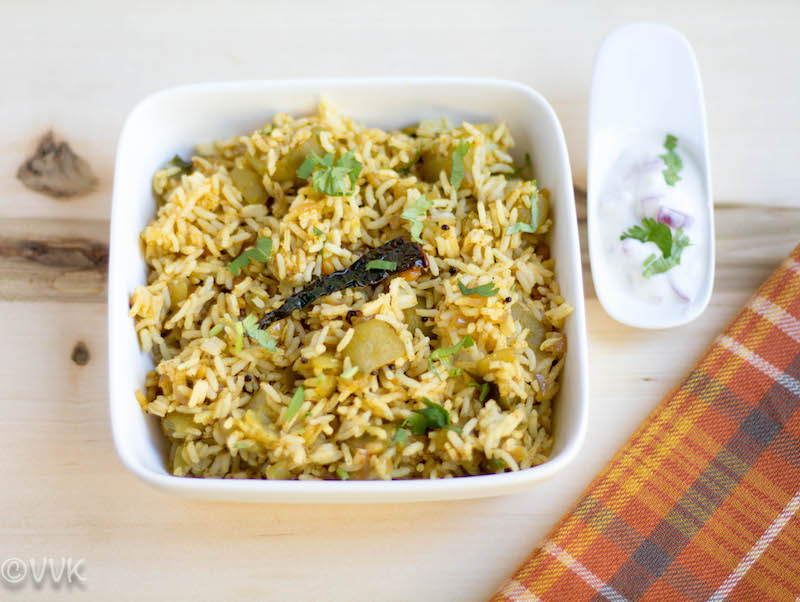 For these vegetable-based rice dishes, I always use vaangi baath and garam masala powder combination. It provides the required spice and flavor and makes it delectable. All you need to do is, do the tempering, cook the veggies with spice powder and finally add the rice and mix. That’s it.