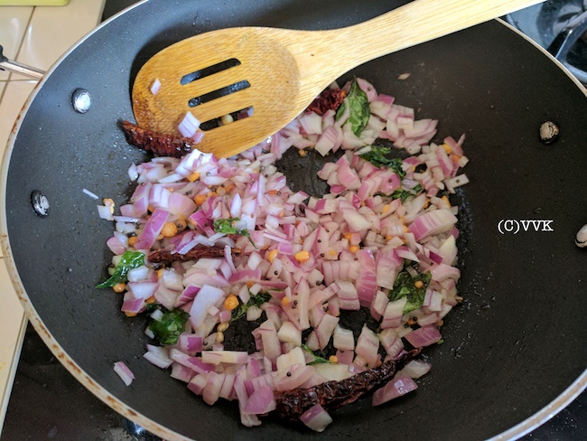 - In a kadai heat the oil and add once the oil is hot, add the mustard seeds, urad dal, and channa dal.