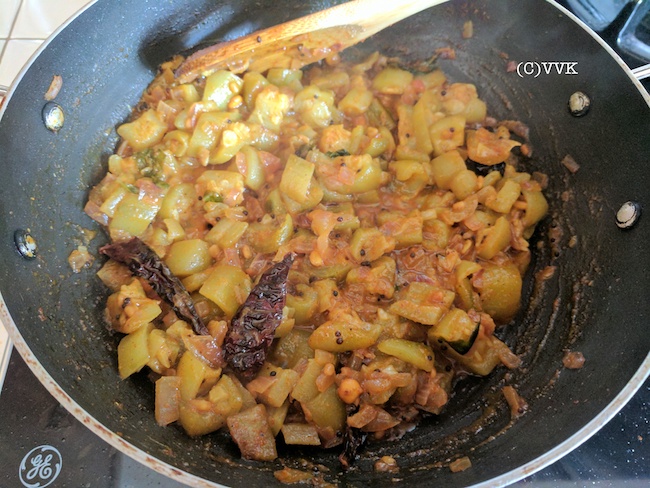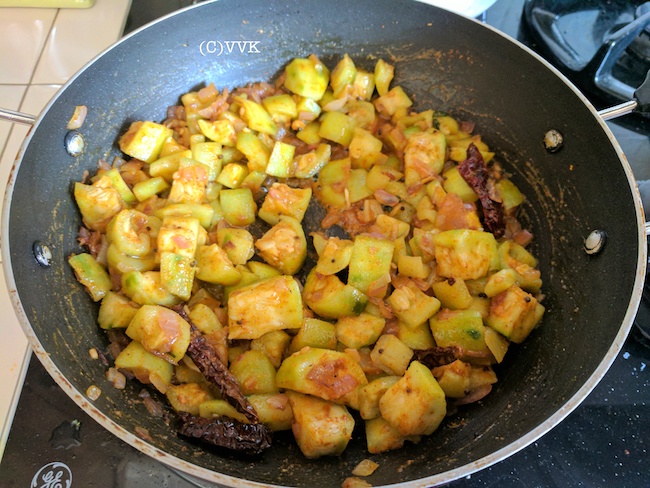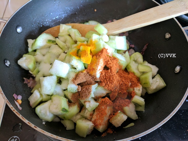 - Then add the chopped ridgegourd, turmeric powder, vaangi baath powder, garam masala, and salt.