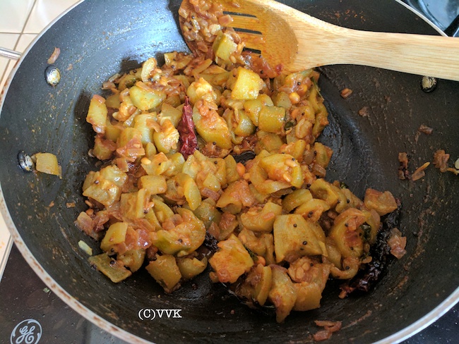 - Do not add any water as ridgegourd oozes out water. After 4 minutes remove the lid.
