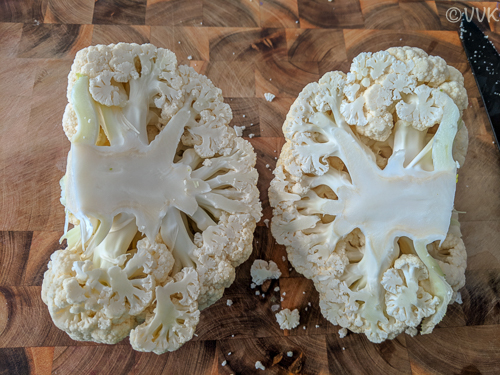 - Using a large knife, cut right through the center of the cauliflower stem, and divide it into two halves.
