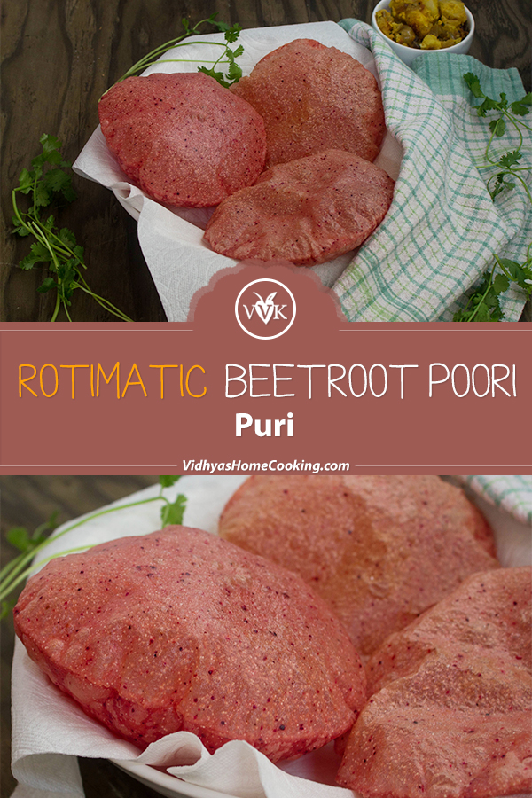 Last week I shared the Rotimatic Masala roti with quinoa flour and now it’s the time for poori. The next in the rotimatic series is the puri, precisely beetroot poori – a recipe that pleases your palate both visually and tastewise.