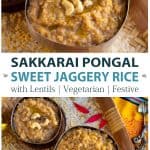 The word pongal refers to two things. It refers to the Indian harvest festival pongal and also the dish pongal. Sakkarai pongal is the sweet jaggery rice, and that’s what I am sharing today, and the savory one is the ven pongal.