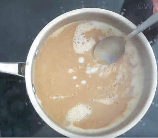 - When you see bubbles on top as shown in the picture, add the milk and mix. Simmer it for a minute or two. I usually simmer it for one minute.