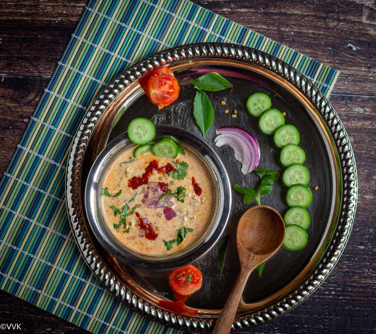 - Finally, add the onion, curry leaves, and cilantro. Mix and close the mason jar. Refrigerate overnight. Before serving, mix well and if needed, add more yogurt/buttermilk and more onions and enjoy! Refer notes for salt. You can also add freshly grated carrots, raw mangoes, grapes, or pomegranate arils.