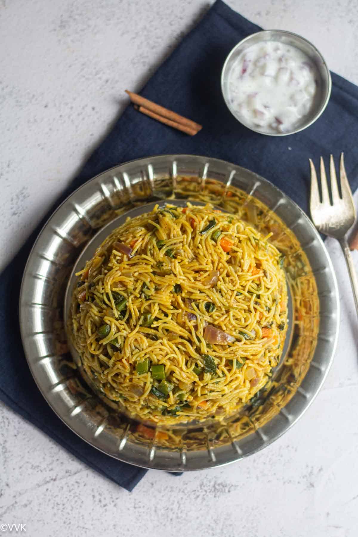 close up shot of semiya biryani served on a steel plate with raita on the side