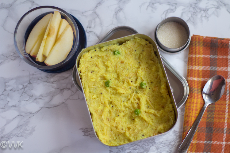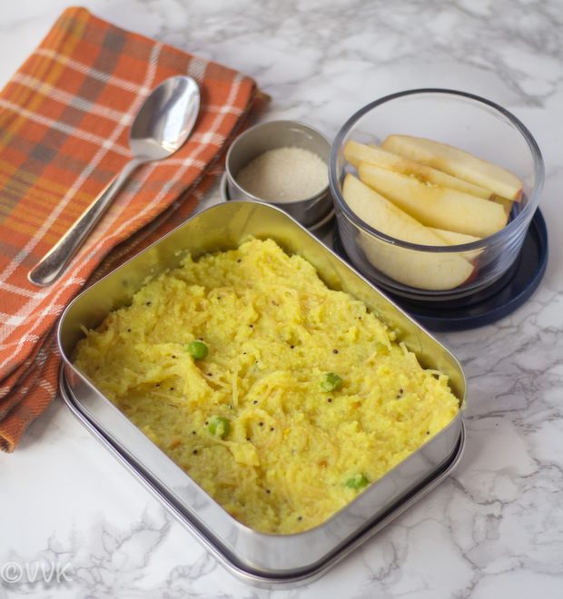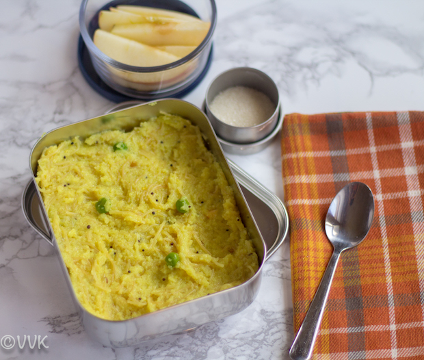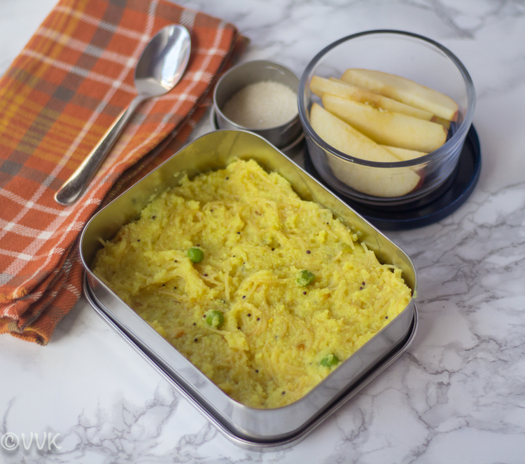 This semiya kichadi is one of his trademark dishes. Both vaandu and I love this very much, and yes this time, he made this exclusively for the marathon. I just clicked the pictures. I know it’s a cheat post, but when it comes to Vaandu’s lunchbox series, I cannot skip this. When we make this in the mornings, we only add peas. But you can add carrots, beans and make it more colorful.