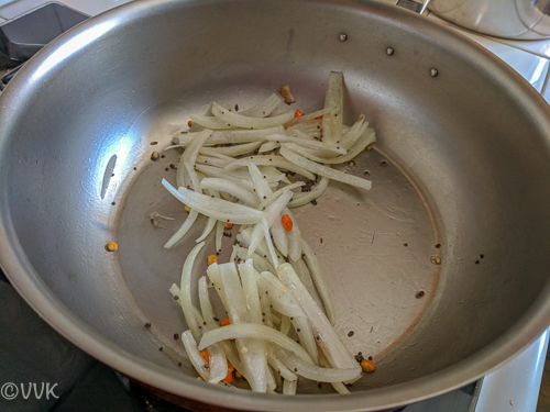 - When the mustard seeds splutter, add the chopped onion and green chili.