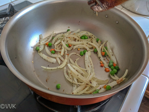 - Saute until they turn translucent and then add peas and cook for two minutes.