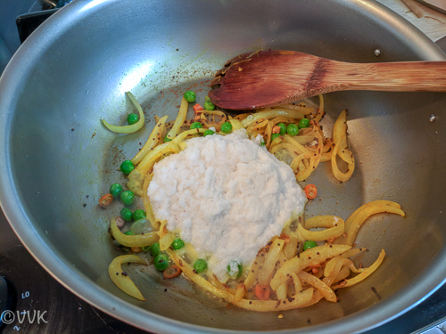 - Slowly add the roasted semiya and rava. Keep stirring while adding the rava and semiya so that it doesn't form lumps.