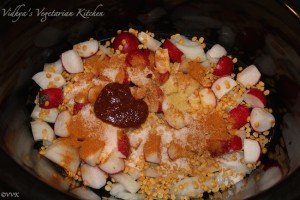 - Mix 1.5 tsp of tamarind paste with 1.5 cups of water. To this, add the chopped red radish and salt. Cover and cook for 5 to 7 minutes.