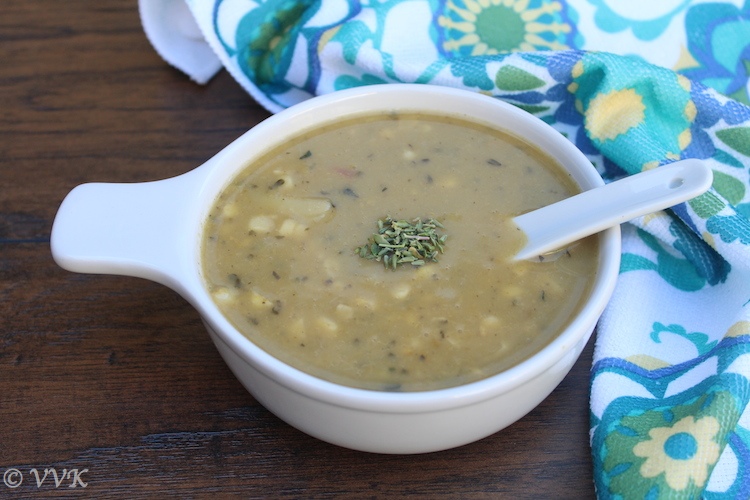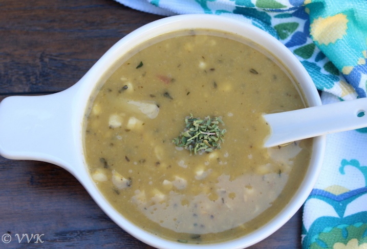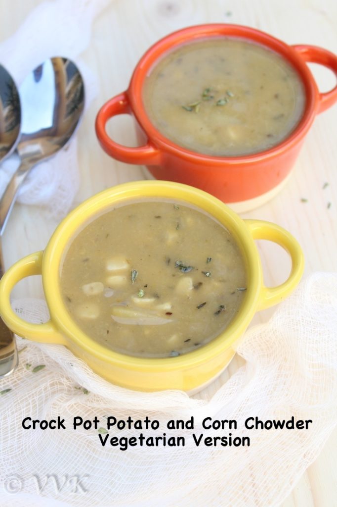 Here is a simple vegetarian Crockpot Corn and Potato Chowder loaded with goodness of corn, dried thyme and oregano. I prepared it as a low calorie stew. I didn’t use any butter or any oil and instead of adding heavy cream or half and half, I went with 2% milk. You can even opt for fat free skim milk and I used all-purpose flour to thicken the chowder.