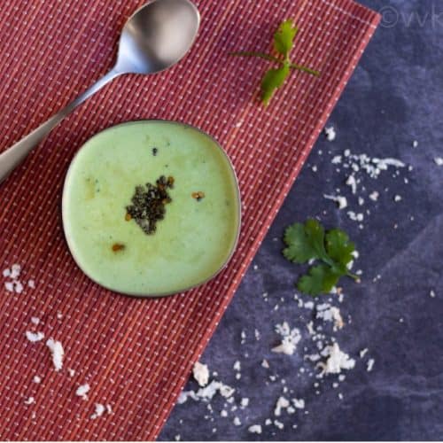 I learned this recipe from my mom, who made it one day when she did not have sufficient spinach for making kootu. When she told me about this raita, I made it right away and, in due course, experimented more and added curry leaves and cilantro to make it more delicious.