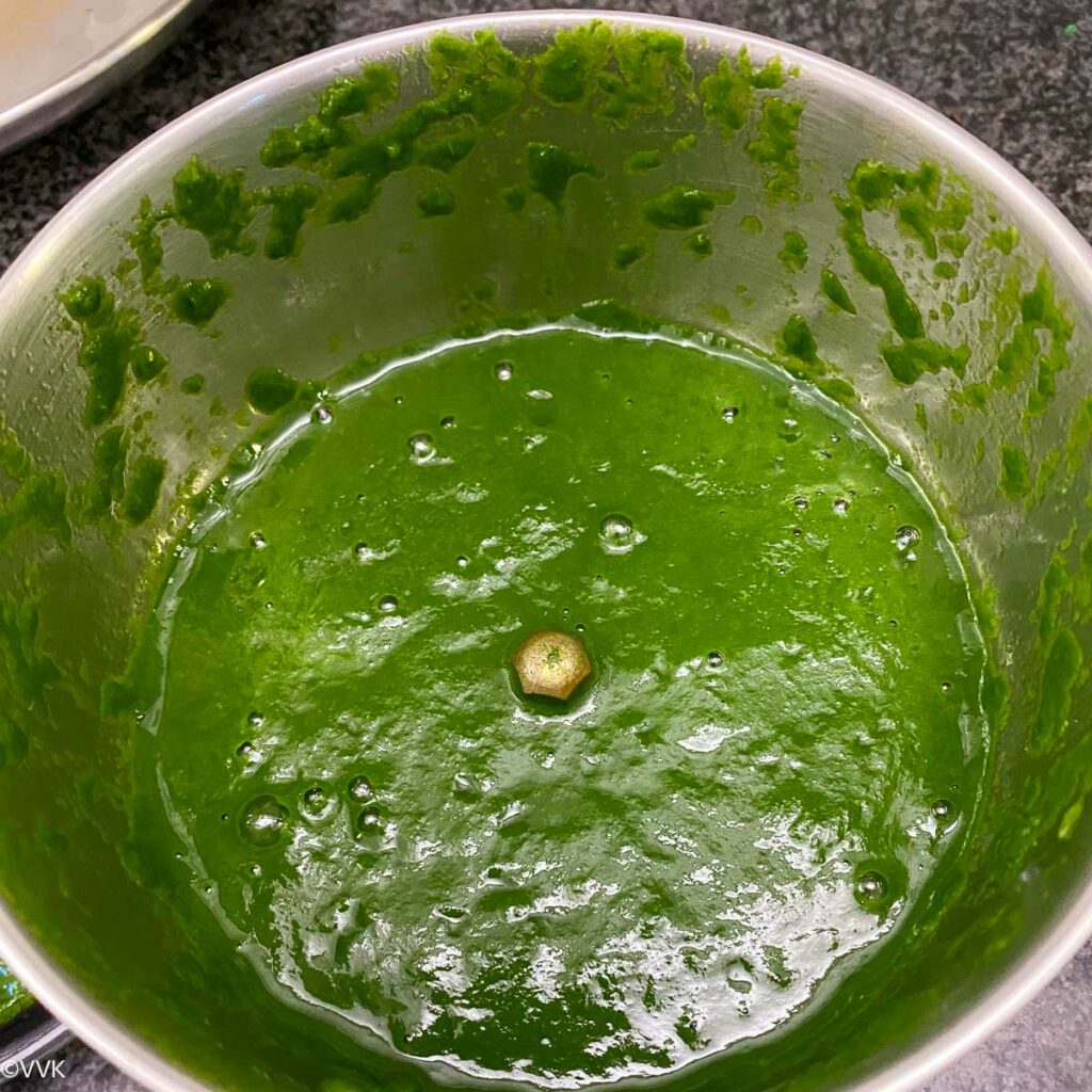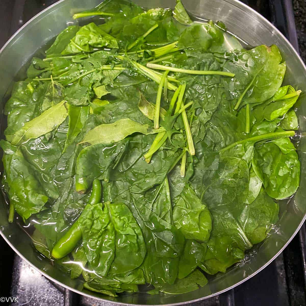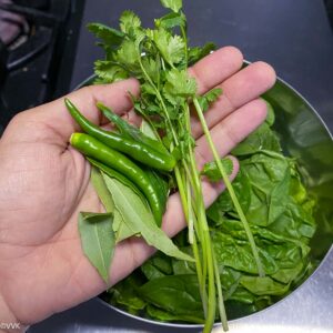 1) Blanch the spinach along with green chili, cilantro, and curry leaves.