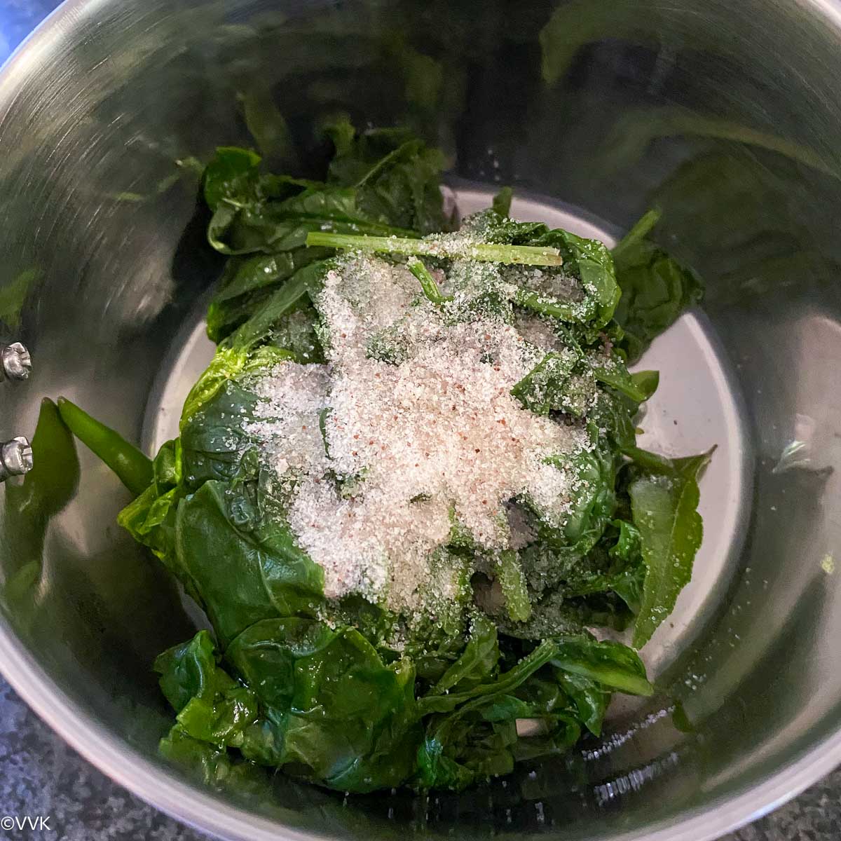 1) Blanch properly – We are not cooking the spinach separately. So make sure to blanch the spinach in hot water, and also right after draining the water, rinse the spinach with ice-cold water to stop the cooking and retain the vibrant green color.