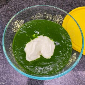 3) Blend the yogurt properly with the pureed spinach – You can either whisk the yogurt before adding to the puree or, if you are like me, add the thick yogurt to the spinach puree and, using a hand whisk, mix it thoroughly without any lumps.