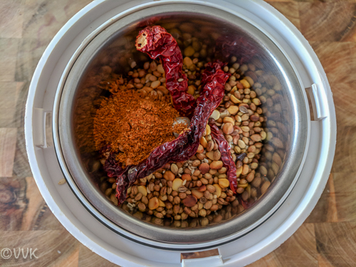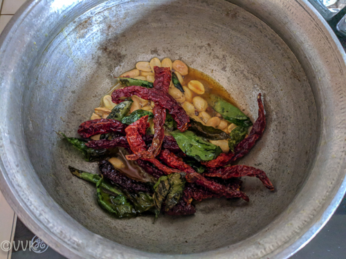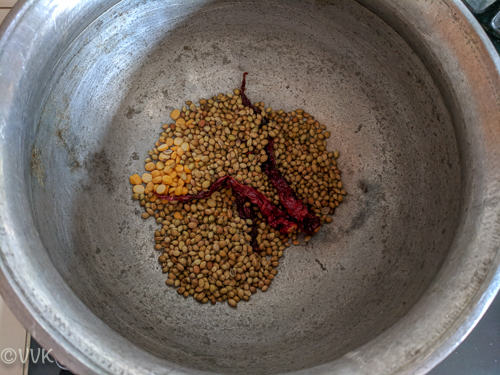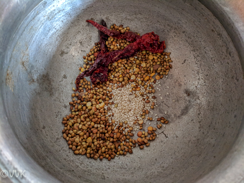 - Take a heavy-bottomed vessel or kadai and roast the coriander seeds, red chilies, and chana dal without oil until fragrant over medium heat. Reduce the heat to low, add the sesame seeds roast for a minute, and turn off the heat.