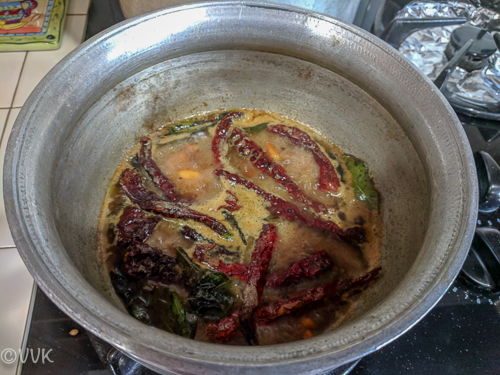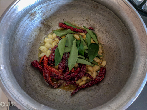- Add mustard seeds, chana dal, urad dal, fenugreek, curry leaves, and red chilies when the oil is hot.