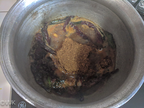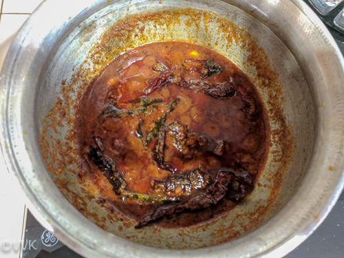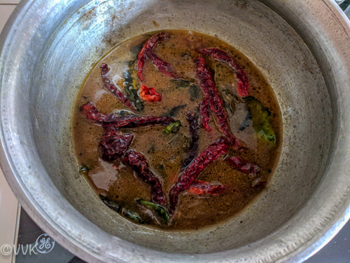 - Prepare the gojju/gravy with the ground spice mix and the tamarind extract.