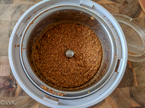 - Allow it to cool, and grind the roasted spices and rasam powder without adding water.