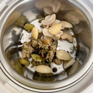 - Now grind the almond, cashews, fennel seeds, poppy seeds, whole pepper, and green cardamom by adding ¼ to ½ cup of water into a smooth paste.