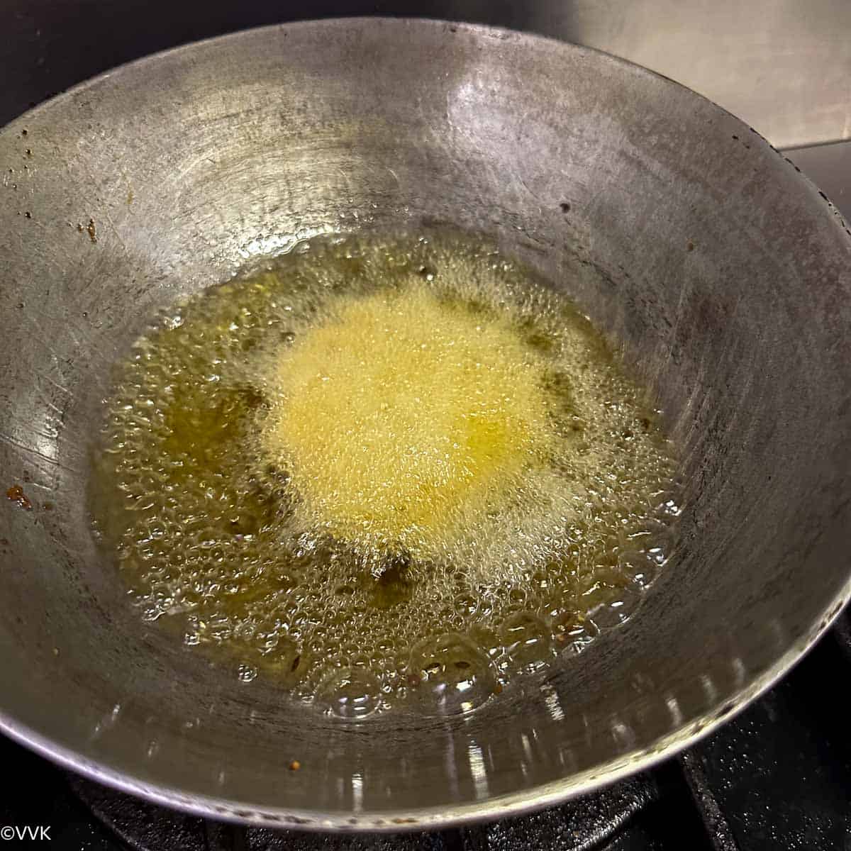 VVK Tip: Promptly transfer the urad dal to a plate after roasting. If left in the pan, especially a heavy-bottomed one, the residual heat may cause the dal to continue cooking and darken in color.
