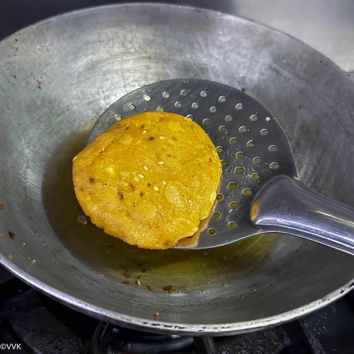 - Meanwhile, heat the oil for frying, and when the oil is hot, fry the thattai until the bubbling sound ceases.