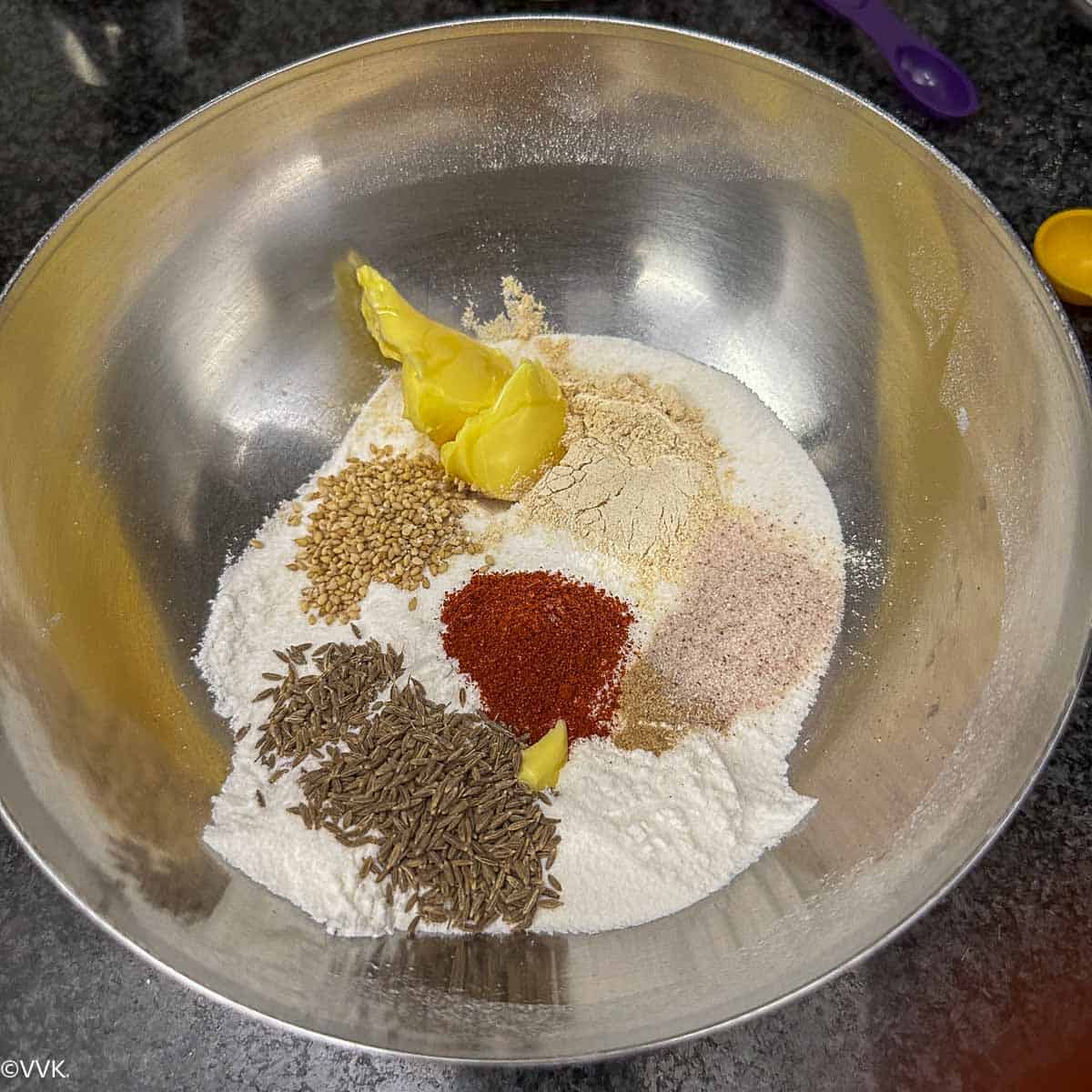 - Add the rice flour, urad dal flour, cumin seeds, asafoetida, white sesame seeds, salt, chili powder, and butter in a large mixing bowl.