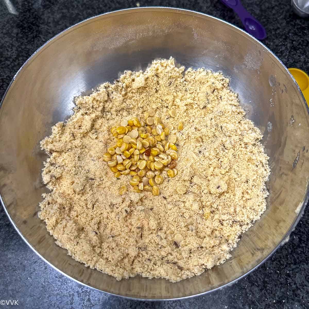 - Mix well until it becomes crumbly. Now add the soaked chana dal and mix.