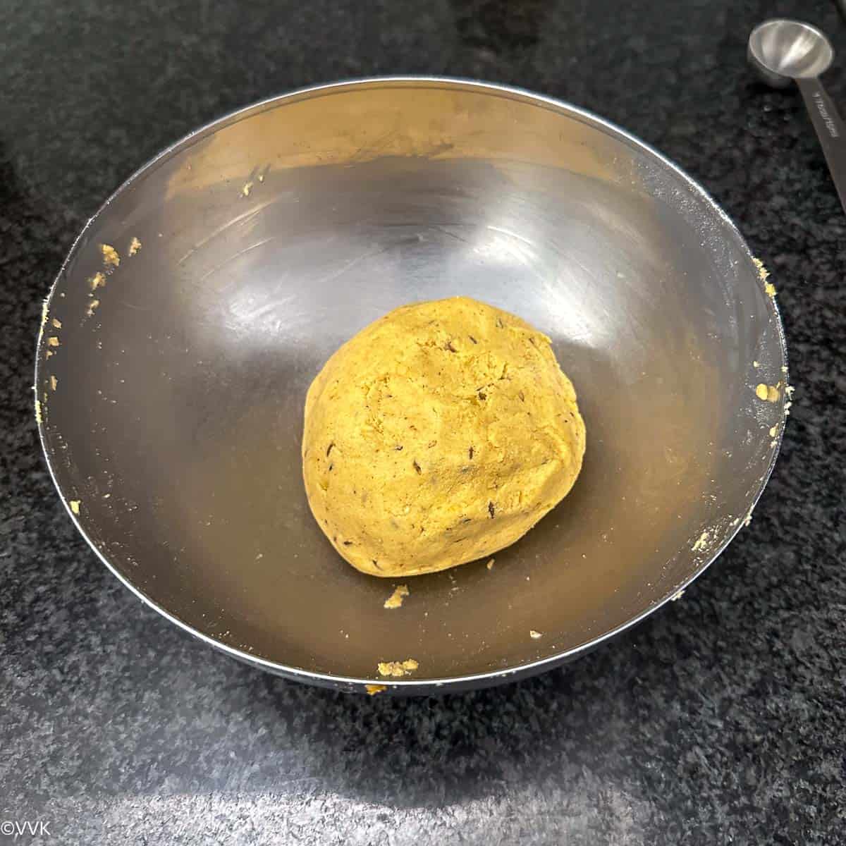 - Slowly add water and knead it into a soft, smooth dough. It should not stick to the vessel and knead the dough like a big ball.