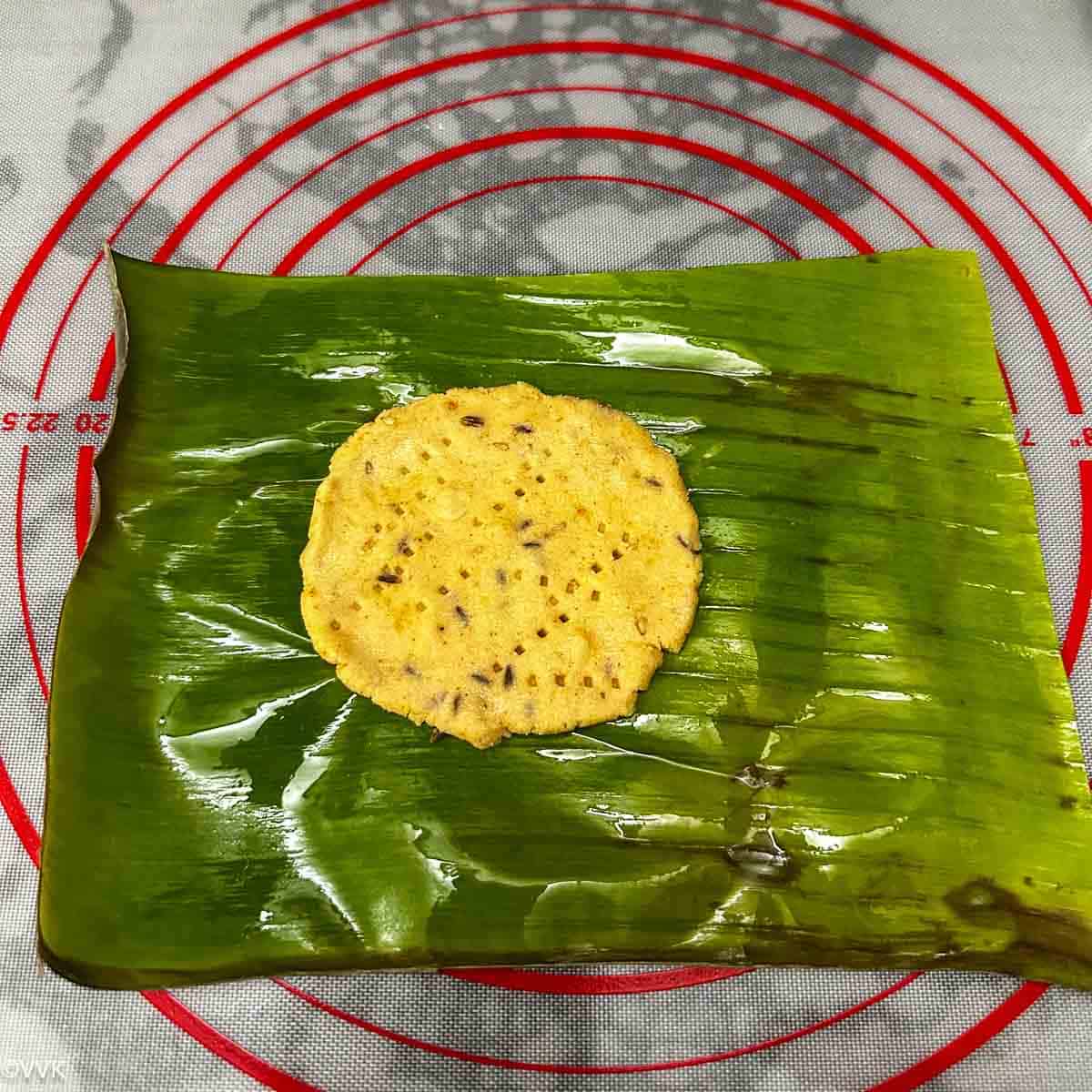 - Alternatively, you can rub a little coconut oil on your palms, place the dough balls on the ziplock bag or banana leaf, and flatten them as thinly as possible—this is my preferred method.