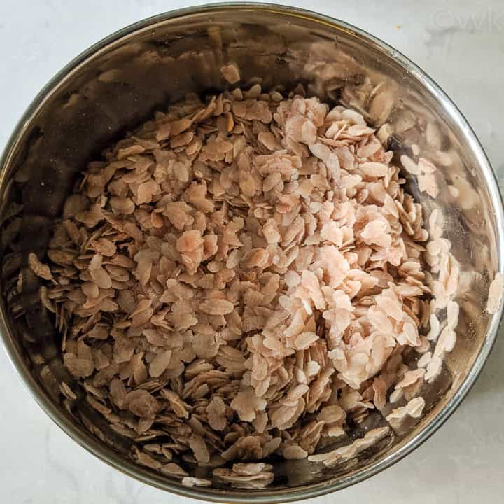 - Wash the flattened rice thoroughly and drain the water. Now sprinkle ½ cup of water and let it sit for 8 to 10 minutes. A minimum of 5 minutes is sufficient.