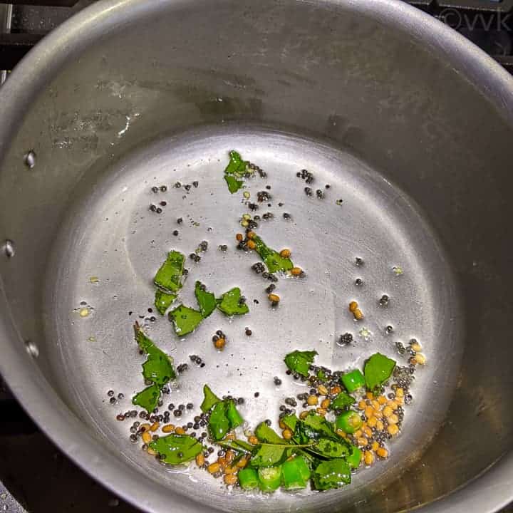 - When the oil is hot, add the mustard seeds, urad dal, and chopped green chili. Let the mustard seeds splutter and then add the curry leaves—Fry for 30 seconds.