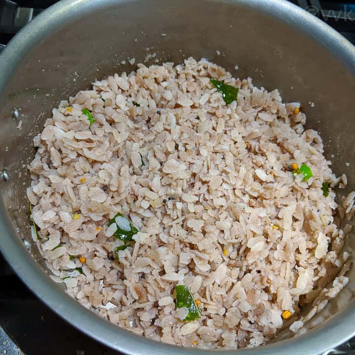 - Reduce the heat to medium-low. Now add the flattened rice. (flattened rice would have absorbed all the water that you sprinkled by now) Add the salt and gently mix.